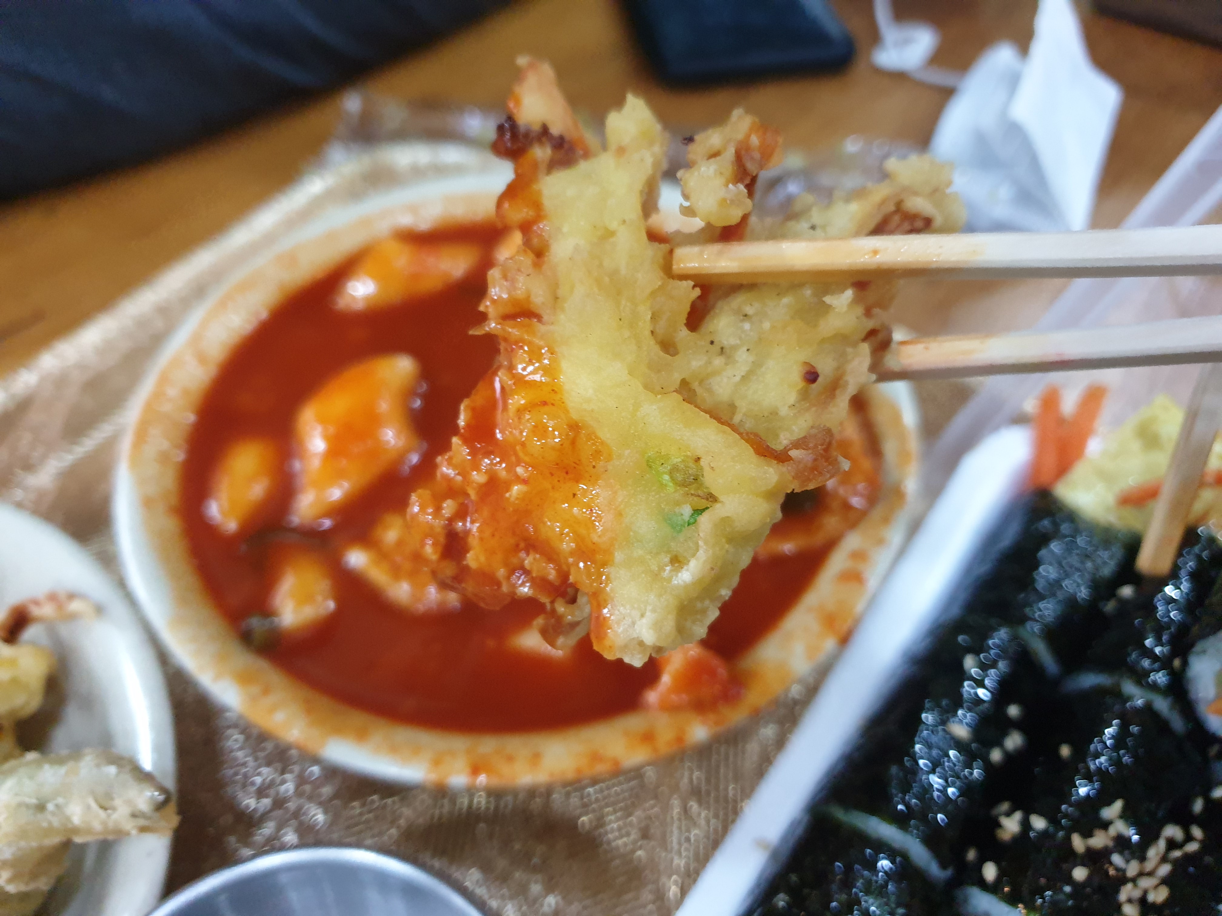 떡볶이 국물에 찍어서 먹어보았습니다.