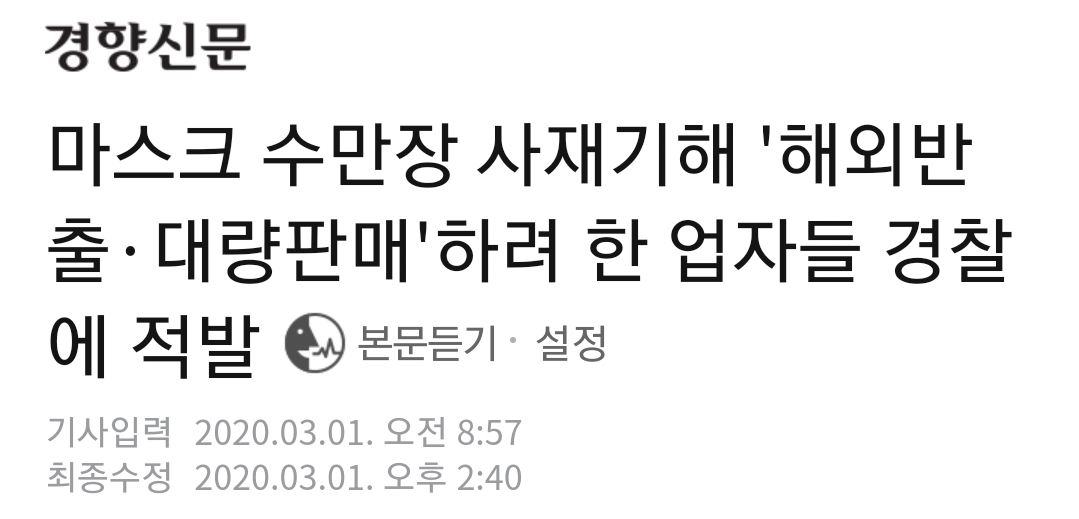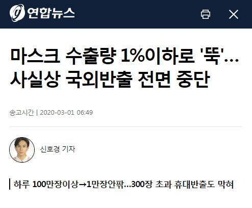 마스크 수출량 1%이하로 '뚝'…사실상 국외반출 전면 중단, 신호경기자, 경제뉴스 (송고시간 2020-03-01 06:49)