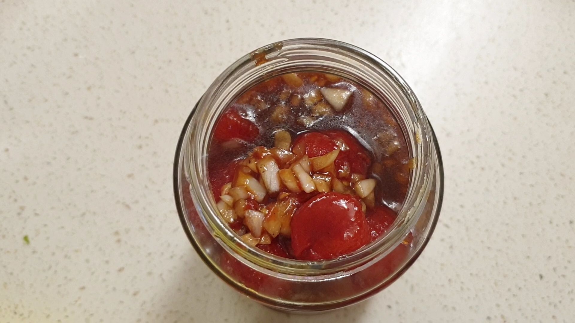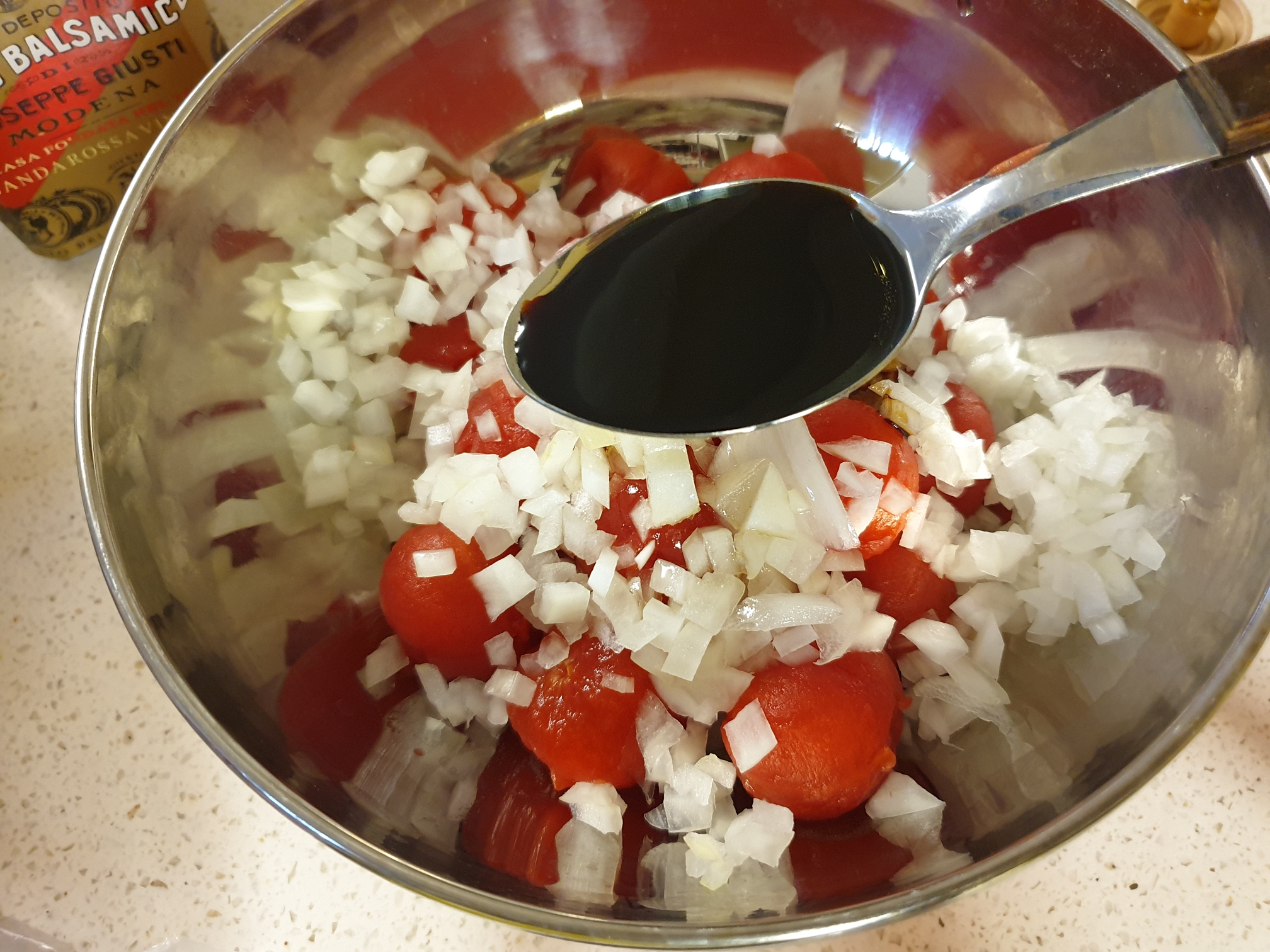 ▶ 재료 : 방울토마토, 양파 조금, 발사믹식초 3스푼, 올리브오일 3스푼, 꿀 3스푼, (레몬즙), 소금, 후추