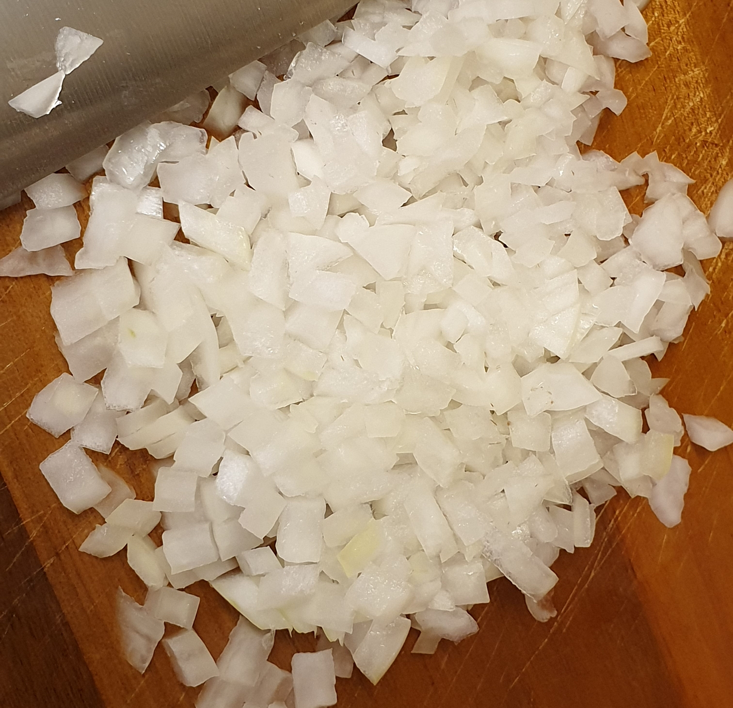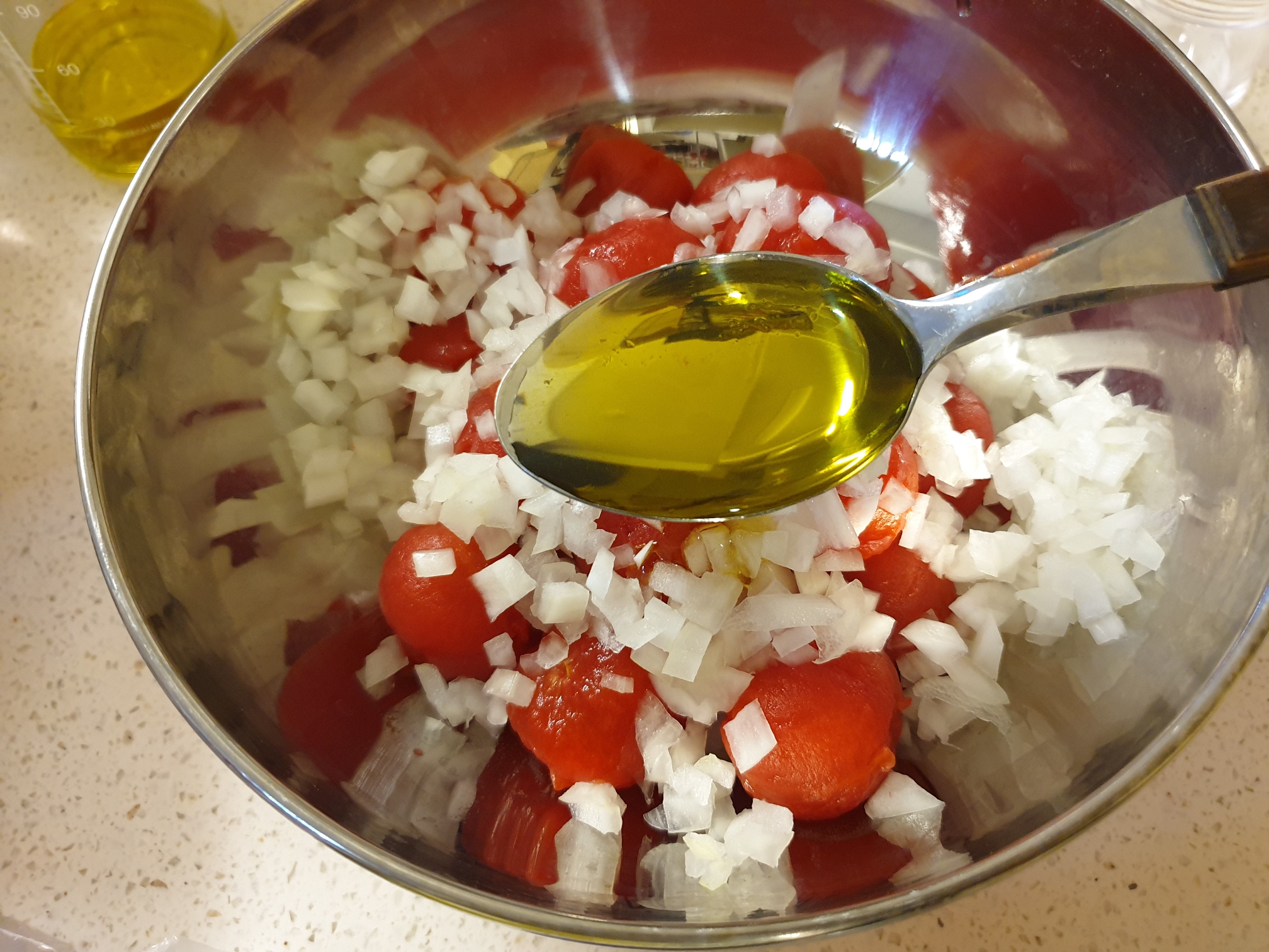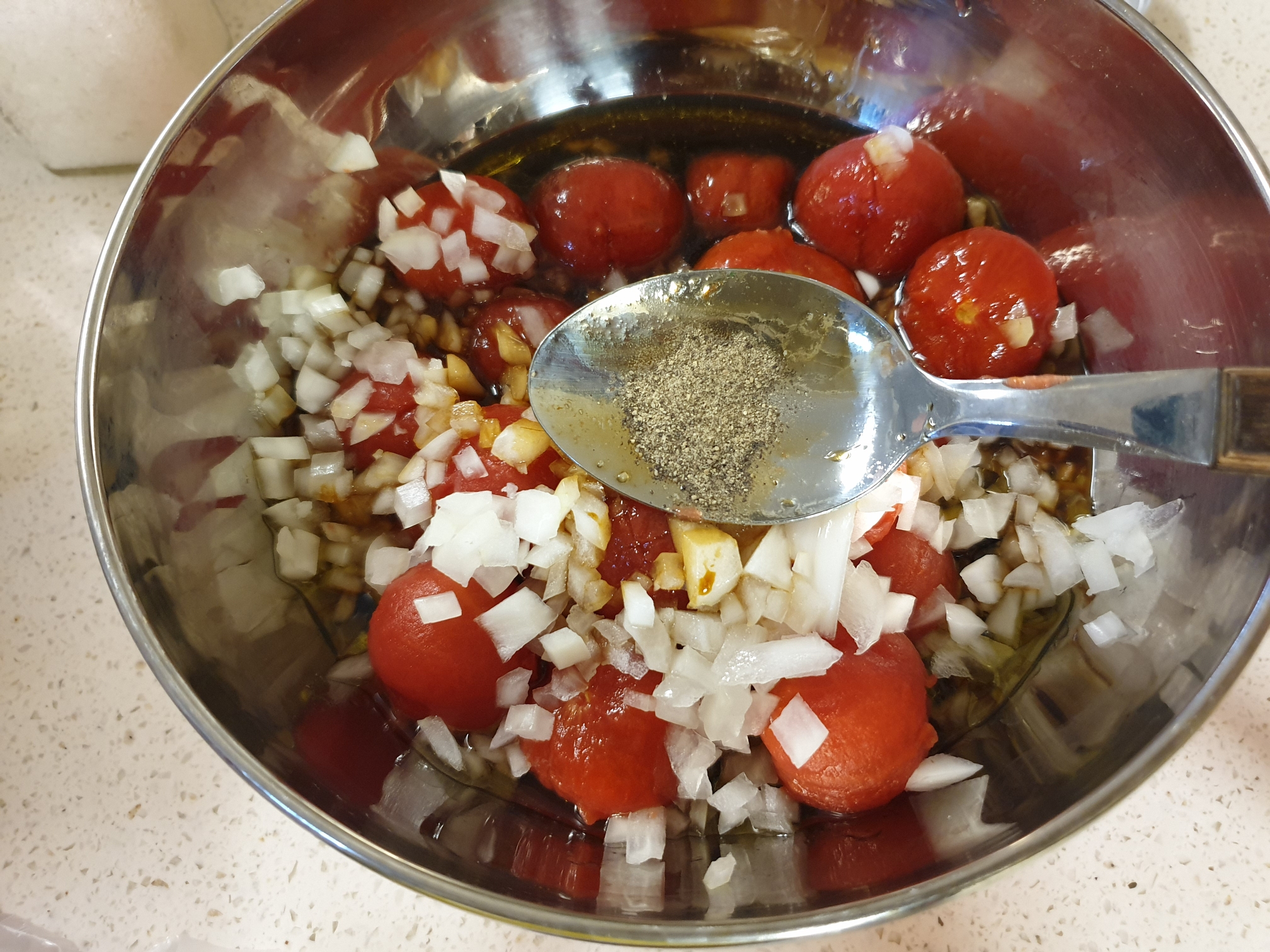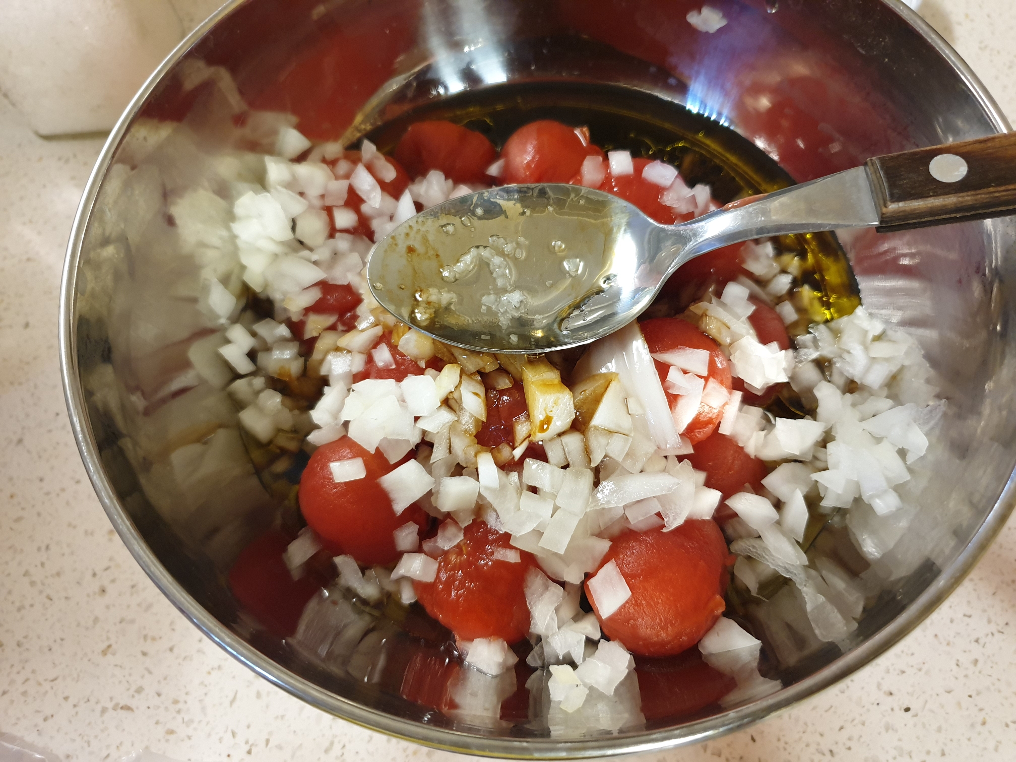 5. 양파를 잘게 다져서 껍질을 벗긴 방울토마토에 섞어주세요.