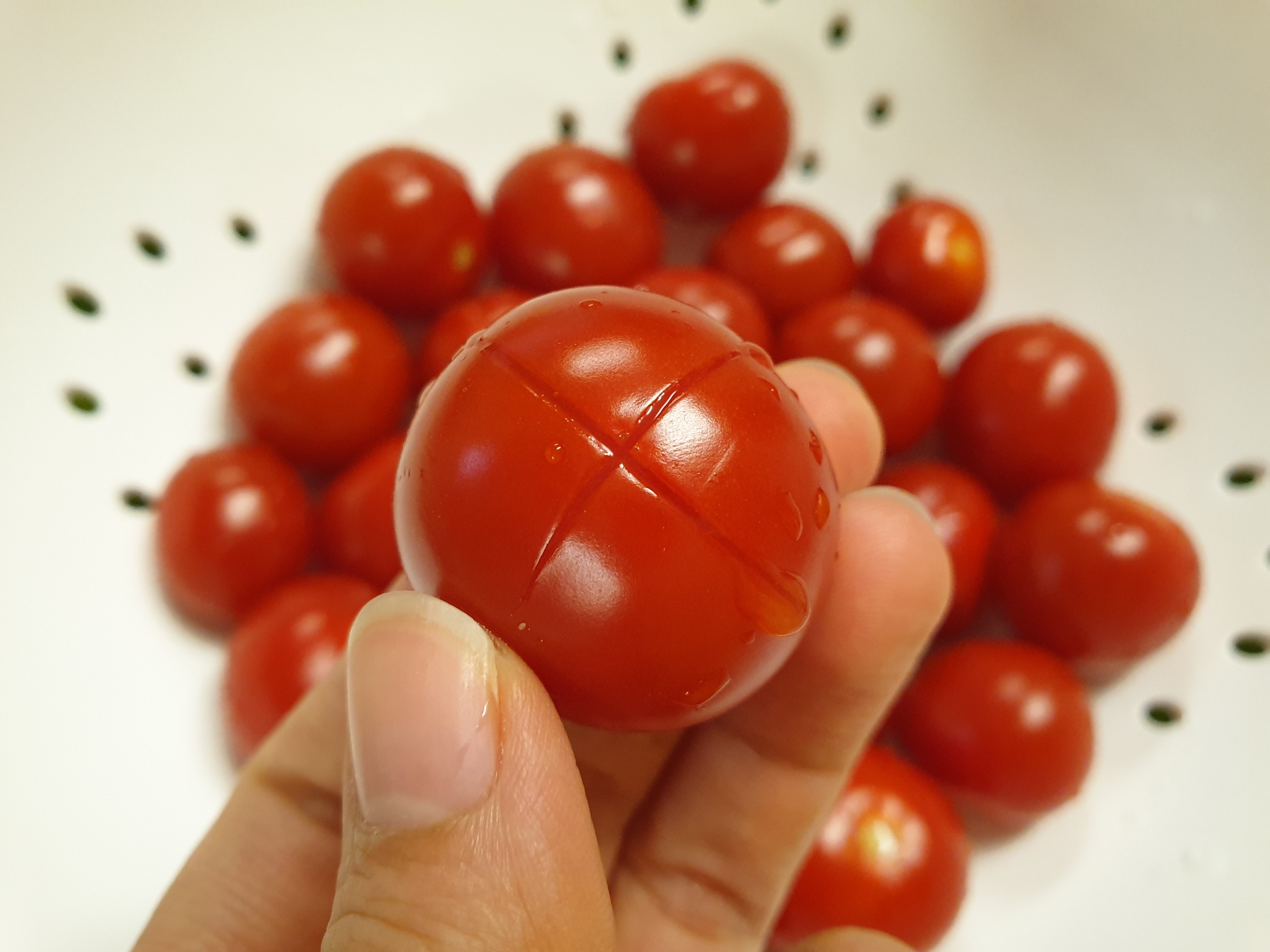2. 토마토에 꼭지 반대편에 십자모양으로 칼집을 내줍니다.