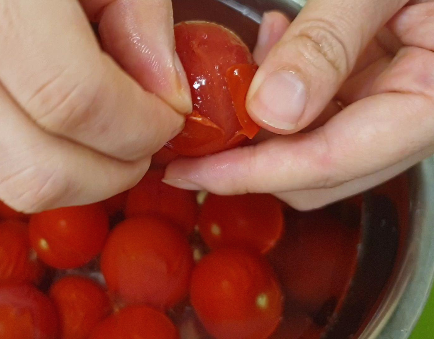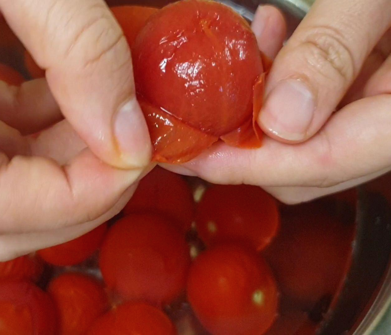 3. 손질된 방울토마토를 끓는 물에 담궜다 뺀다는 느낌으로 20초정도 데쳐주세요.